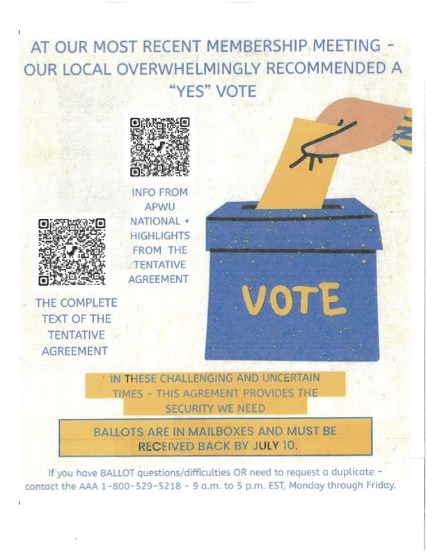 | Update from APWU.org: We did it together! Today, APWU members voted to ratify the new 2024-2027 National Agreement (union contract) between the APWU and USPS. The results were definitive: 95% of voting members said “Yes!” in favor of ratification. That means you have locked in raises, COLAs, job protections and more for the next 3 years. |
