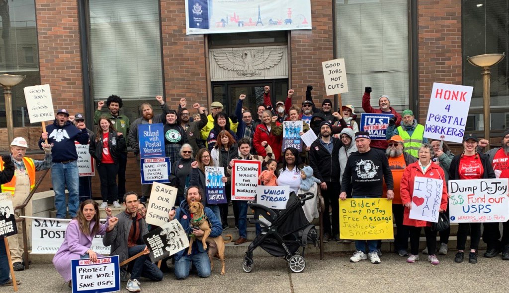 Members of the community joined with Postal Workers for a rally at East Portland Station. Director of Organization Teresa-Marie Oller, President Joe Cogan and representatives from Jobs with Justice, Multnomah County, Teamsters Union, Starbucks Workers Union, NALC, CPWU and others participated with short speeches. Local Officers Editor Travis Epes, Director of Legislation Daniel Cortez and Vice-President Bill Martin were in attendance.